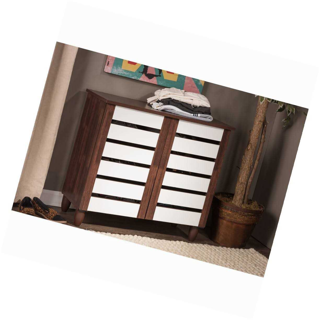 Dimensions: 29.95W x 13.1D x 26.33H in. Constructed of wood and vinyl. 1 compartment. Holds 9 pairs of shoes. Magnetic closing doors. Keep all your favorite shoes sorted in modern style with the Baxton Studio Gisela 2 Door Shoe Cabinet. This eye-catching cabinet features doors that open to reveal three shelves for storage of 9 pairs of shoes. Magnetic closures keep the doors securely closed.