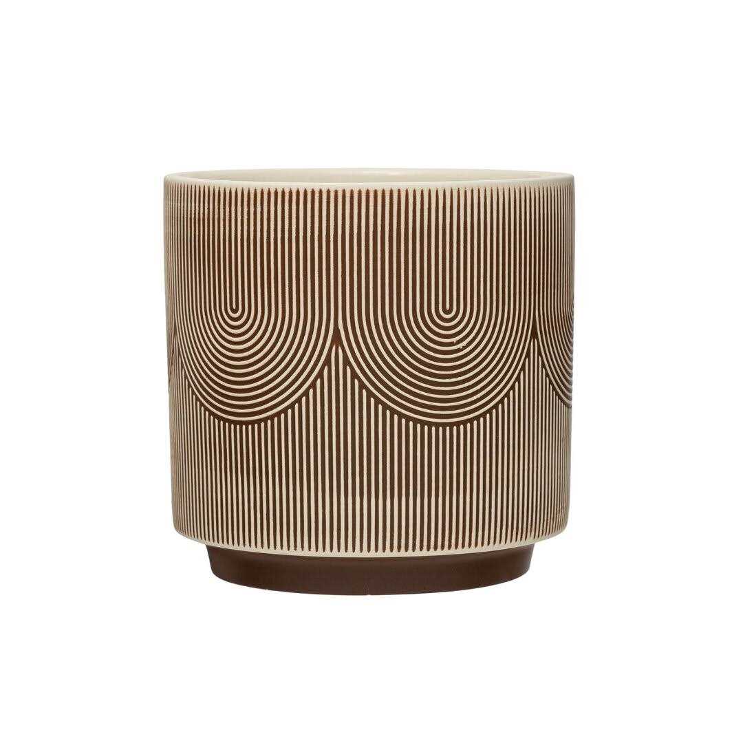 Transform the space with this Textured Stoneware Planter in Brown and Cream. This planter is made of stoneware material that is sturdy and durable. It features a textured surface that gives it a modern and artistic look. The planter has a brown and cream color scheme that matches any home decor and plant type. The planter has no drainage holes, so it is suitable for plants that do not require much water, such as succulents, cacti, or air plants. The planter has no drainage holes, but it is still possible to grow healthy plants with careful watering. The planter measures 6 inches long, 6 inches wide, and 5 inches high and can hold a 4-inch pot. Whether placed on the shelf, table, windowsill, or patio, this planter will add style and personality to the space.