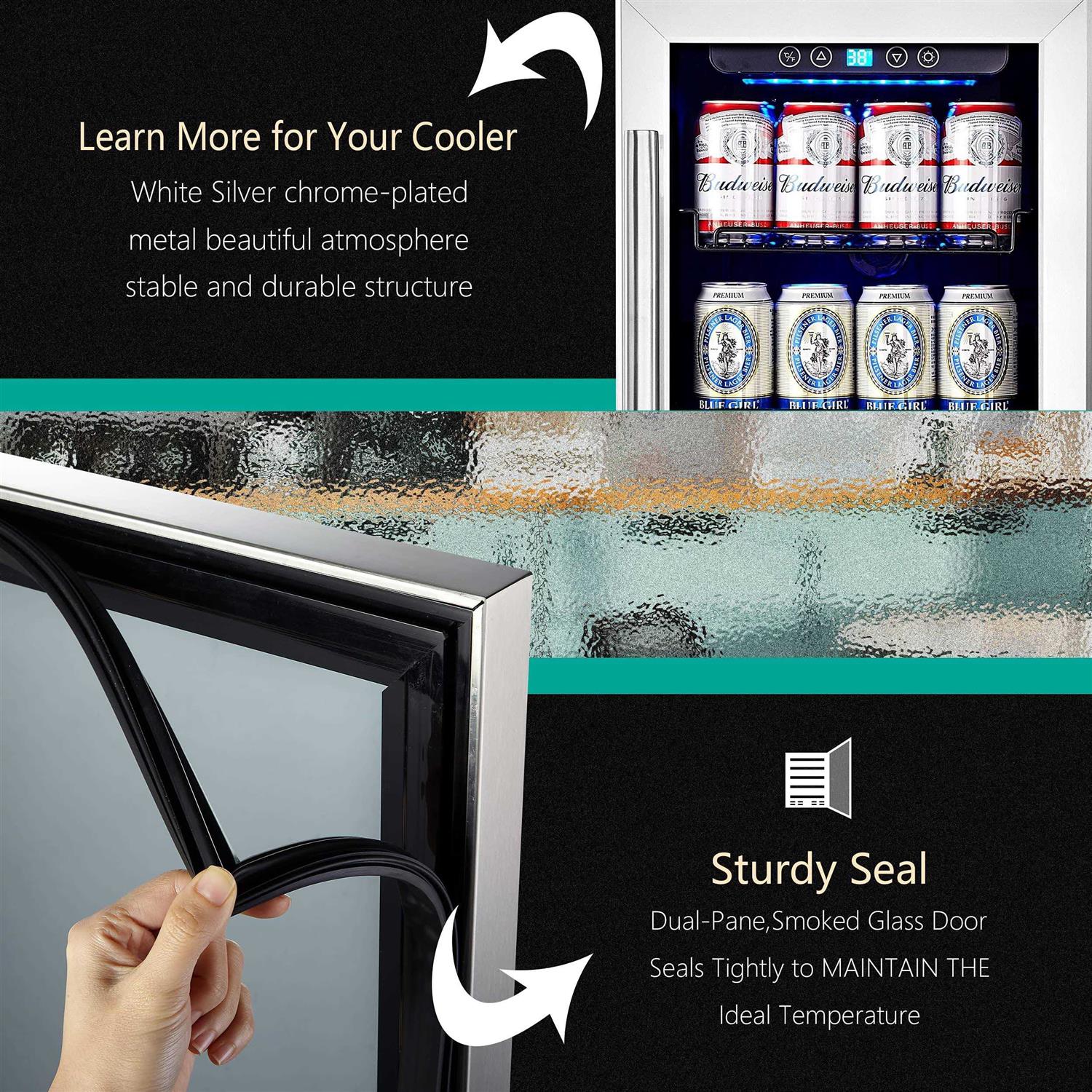 LARGE CAPACITY FOR WINE AND CANS: This mini fridge holds up to 154 cans of your favorite drinks or wines in different size. Soft blue LED light help you selection of your favorite drink at all times. This beverage refrigerator could hold the wine you like too. You would not just enjoy your drink, could enjoy your wine too. STAINLESS STEEL & AIR OUTLET: Special stainless steel frame with 2 layers of tempered glass stabilize temperature levels inside and keep glass from fogging. This wine and beverage refrigerator with automatic defrosting function, this function would work every six hours. The white air outlet is so cool and fit for different kitchen, only Kalamera have this unique design on the market. SINGLE ZONE/ONE-TOUCH CONTROL: LED control display makes it easy to set temperature from 38-50, providing perfect chilling temperature at all times! Kalamera unique design make this small beer fridge could be installed as built-in small refrigerator or freestanding wine cooler. TEMPERATURE MEMORY FUNCTION: These small wine & beverage cooler restore the set temperature in the cooler after it is back on from power lost, which keeps your wine collection from going bad with increasing temperature. The shelf is removable with stopper. On two sides of each shelf placed two stoppers, protecting the bottles from falling when pulling out the shelf. VERSATILE INSTALLATION: Takes just 23.4 x 33.9 x 22.4 inches of space and can be installed under a counter in kitchen or bar area, or used as a freestanding unit!