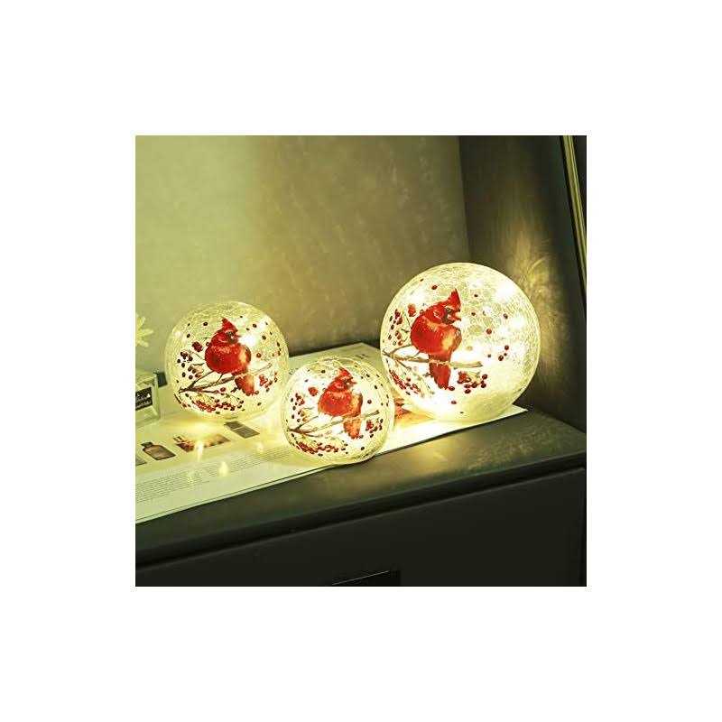 There are 3 sizes for this cardinal light: Large (6″), Middle (5″), Small (4″). This round bird cardinal lamp is battery operated (Batteries NOT Included in Package). 3 AA batteries for 6 inches. 2 AA batteries for 5 inches or 4 inches. When you turn on it, it looks like a beautiful snow globe. This red bird pattern lamp is a very beautiful decoration for home, centerpiece, kitchen, living room. It’s also good for winter as a Christmas decortaion. It’s a perfect birthday gift for women, no matter grandma or mother on mother’s day. Its bird cardinal pattern is artistical as a memorial gift or party decoration. This cardinal night light is an idea cardinal Christmas decorations. The cardinal pattern has been painted on the face of crackle glass ball with stained glass craft. The light is warm white. There are 3 sizes for this cardinal light: Large (6″), Middle (5″), Small (4″). br This round bird cardinal lamp is battery operated (Batteries NOT Included in Package). 3 AA batteries for 6 inches. 2 AA batteries for 5 inches or 4 inches. When you turn on it, it looks like a beautiful snow globe. br This red bird pattern lamp is a very beautiful decoration for home, centerpiece, kitchen, living room. It’s also good for winter as a Christmas decortaion. br It’s a perfect birthday gift for women, no matter grandma or mother on mother’s day. Its bird cardinal pattern is artistical as a memorial gift or party decoration. br This cardinal night light is newly designed in 2022. The cardinal pattern has been painted on the face of crackle glass ball with stained glass craft. The light is warm white.