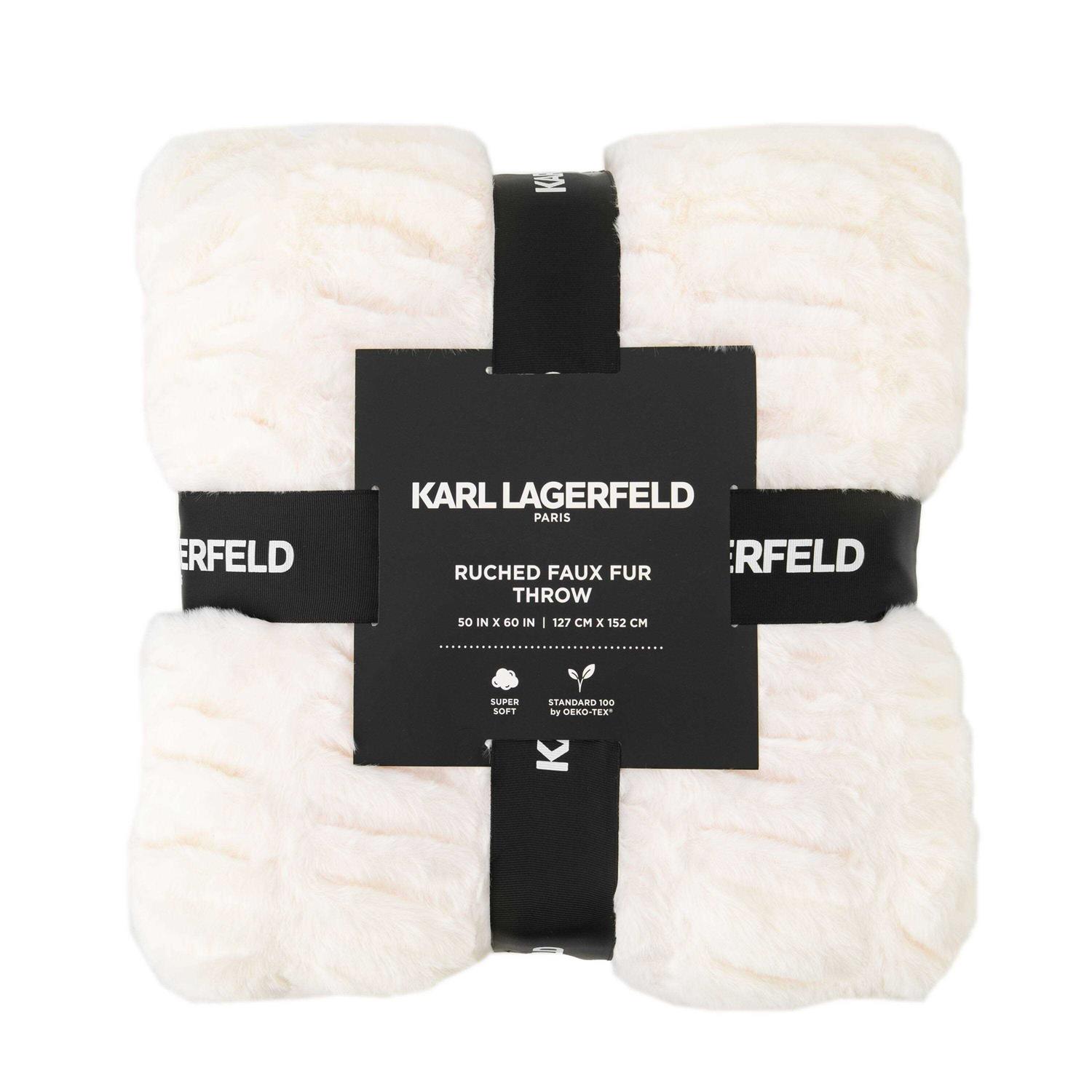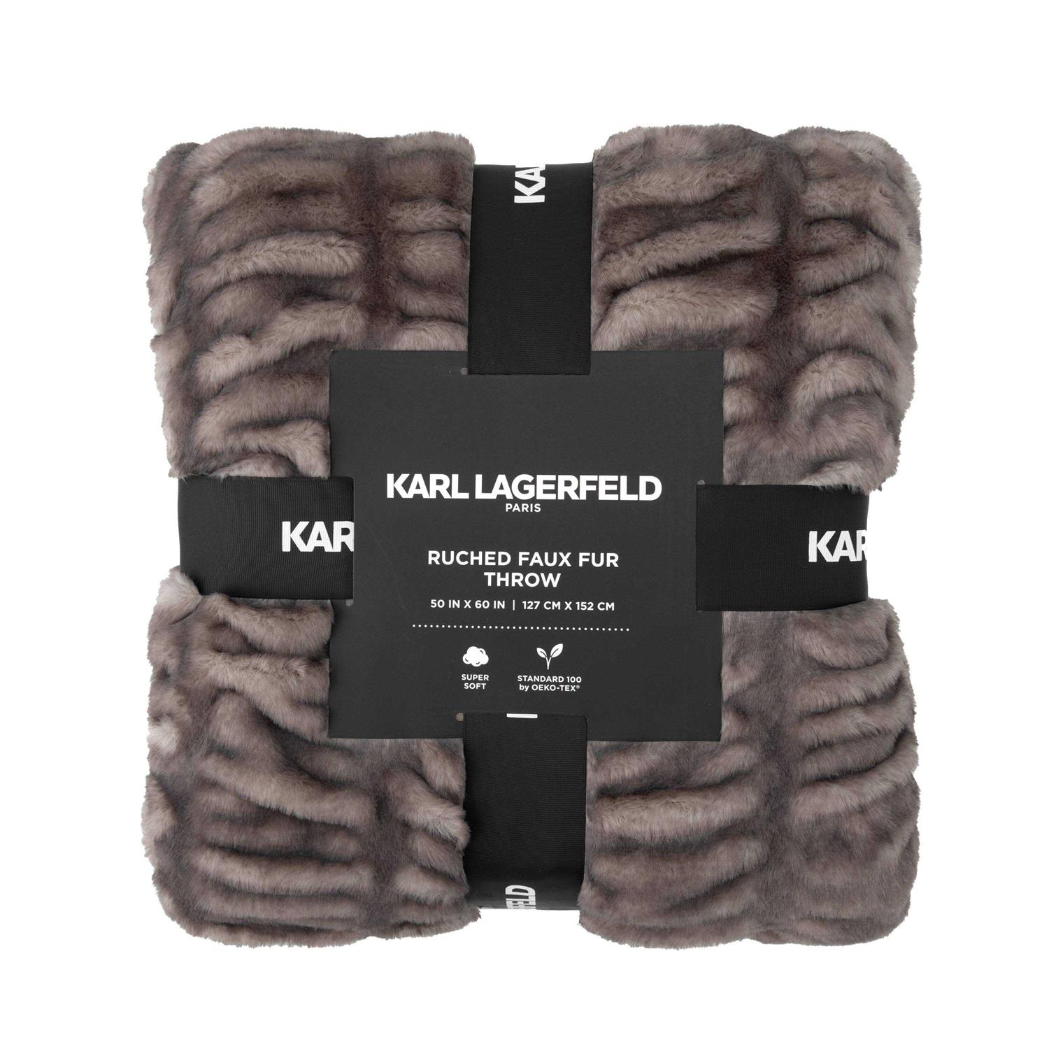 Lounge and daydream of Karl Lagerfeld Paris ruched faux fur throw. Fashionable and cozy faux fur lends the softest touch that instantly relaxes your senses. A sleek black ribbon presents this throw as the perfect gift.