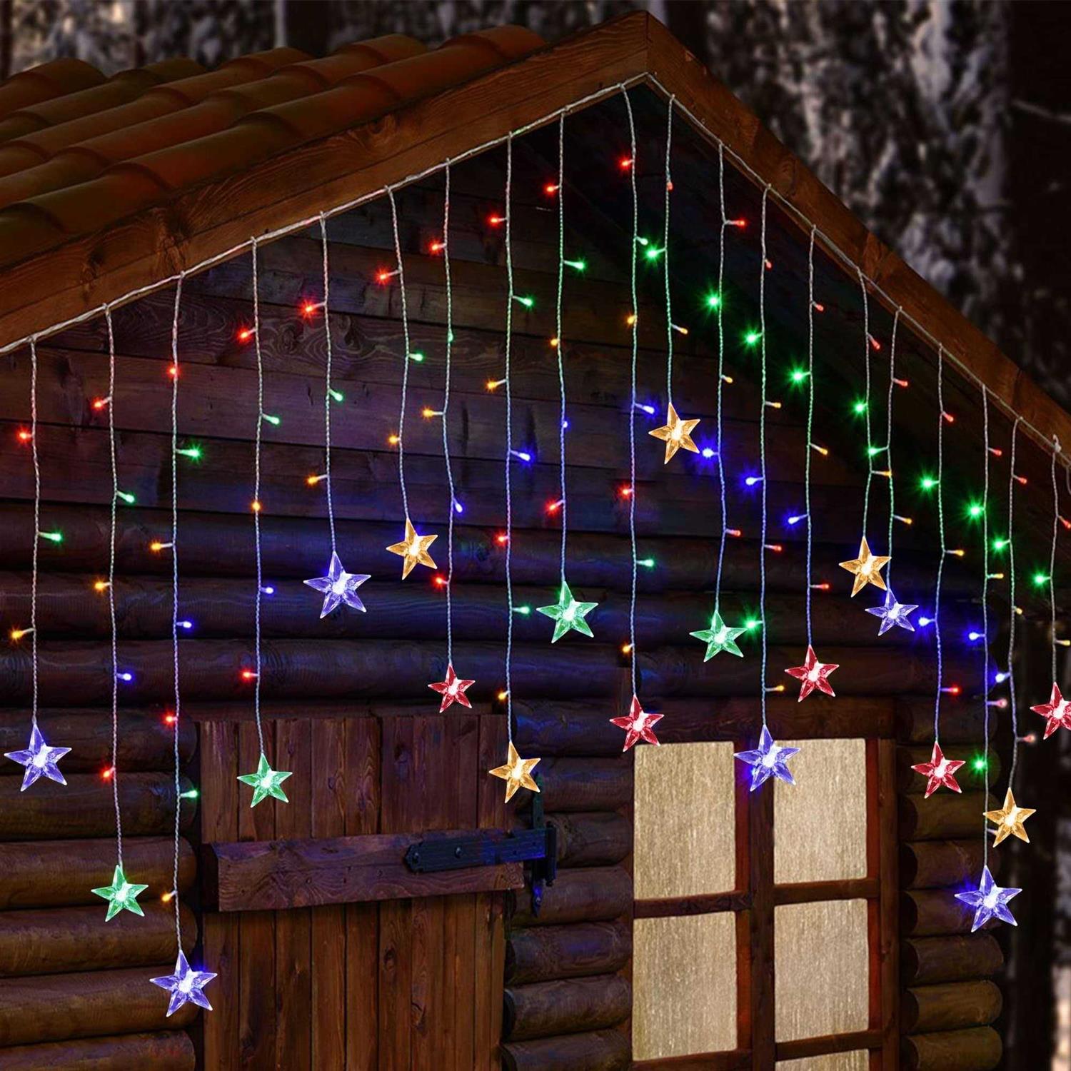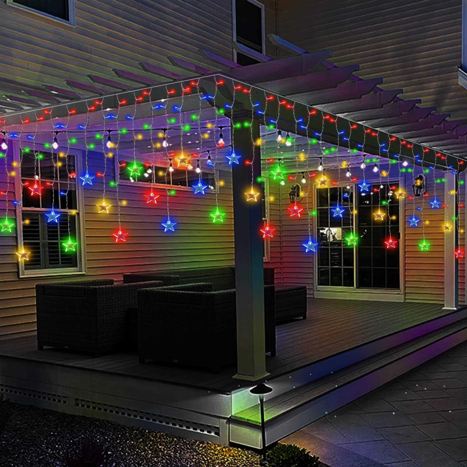 Christmas Icicle Lights With Star: 150 LED multi color icicle lights, 13.1ft x 9.8ft with 30 drops, each hanging Christmas lights has a Christmas Star at the end of string. 8 Twinkle Modes Choices: This Fairy Lights is available with 8 different flash functions, you can choose the mode according to your preference and different occasions. Conectable and Extentable: Our Outdoor icicle lights has an end-to-end plug , enable you connect several led lights together for a larger illumination space. Waterproof and Safe Low Voltage: Operated with low voltage transformer, will not overheat after long time use. Short-circuit protection design can ensure and maximize your family’s safety. Good Quality: All materials are RoHs & UL standards and qualified. Attention: PLEASE DO NOT cut the plastic tie. Specification : /b br br Size:13.1ft x 9.8ft/4m x 3m br Light
