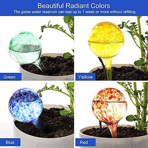 The glass watering globes is a work of art that watering your plants for you every day. They are made of beautiful and colorful hand-blown stained glass water bulbs which is best solution for routine household plant self watering. All you have to do is fill full the Water globe with tap water and press in the soil is automatically given to your plants, and no need to use your watering can or monitor the soil to save your time.The secret is that as soil becomes dry,it releases oxygen into the globe,the water flow out in the soil of dry condition as your plant needs . Watering lasts for up to two weeks, until you refill the waterer spikes.It’s great for house plants, hanging plants, and patio plants and perfect for business travelers, vacations, or forgetful gardeners! Feature: 1. The high-quality self watering spikes can automatically provide moderate water for your plants. 2. Simple and convenient to use, just insert the pipe into the soil, and the water can be drained slowly by automatically. 3. With 6 various colors, these indoor plant watering globesAC add a decorative touch to any planting area! 4. With a transparent design, you can see clearly the capacity of the remaining water in the plant watering, which can help you to replenish water in time. 5. Very suit to water indoor plant, household plants, potted plants, garden plants, hanging plants, etc. Specifications:Size: 6”*2.4”(Diameter x Length)Application: Indoor,Garden,Balcony,etc Package Included: 6 x plant watering devices Note: 1. Due to different ambient light and display device settings, please understand that there may be some deviation between the picture you see and the item itself. 2. The data is measured manually, there may be some deviations, but it does not affect the use.