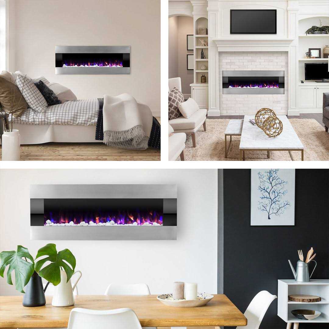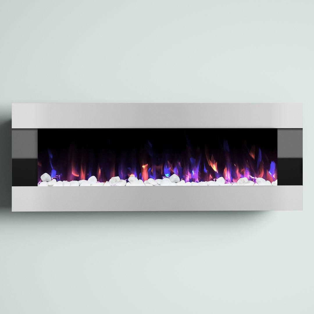 Steelside Form and function align with this wall-mounted electric fireplace that gives you ample heat when the days (and nights) get a bit chillier, without taking up extra floor space. It features two heat settings and a no-heat option along with a timer and adjustable LED flickering flames in various colors – all manageable with the click of a remote. Sleek and clean-lined, it has a metal frame with a silver finish for an industrial feel. Decorative clear crystal, pebbles, and fire glass also come with this fireplace for a touch of modern style. Plus, mounting hardware is included for hassle-free installation.