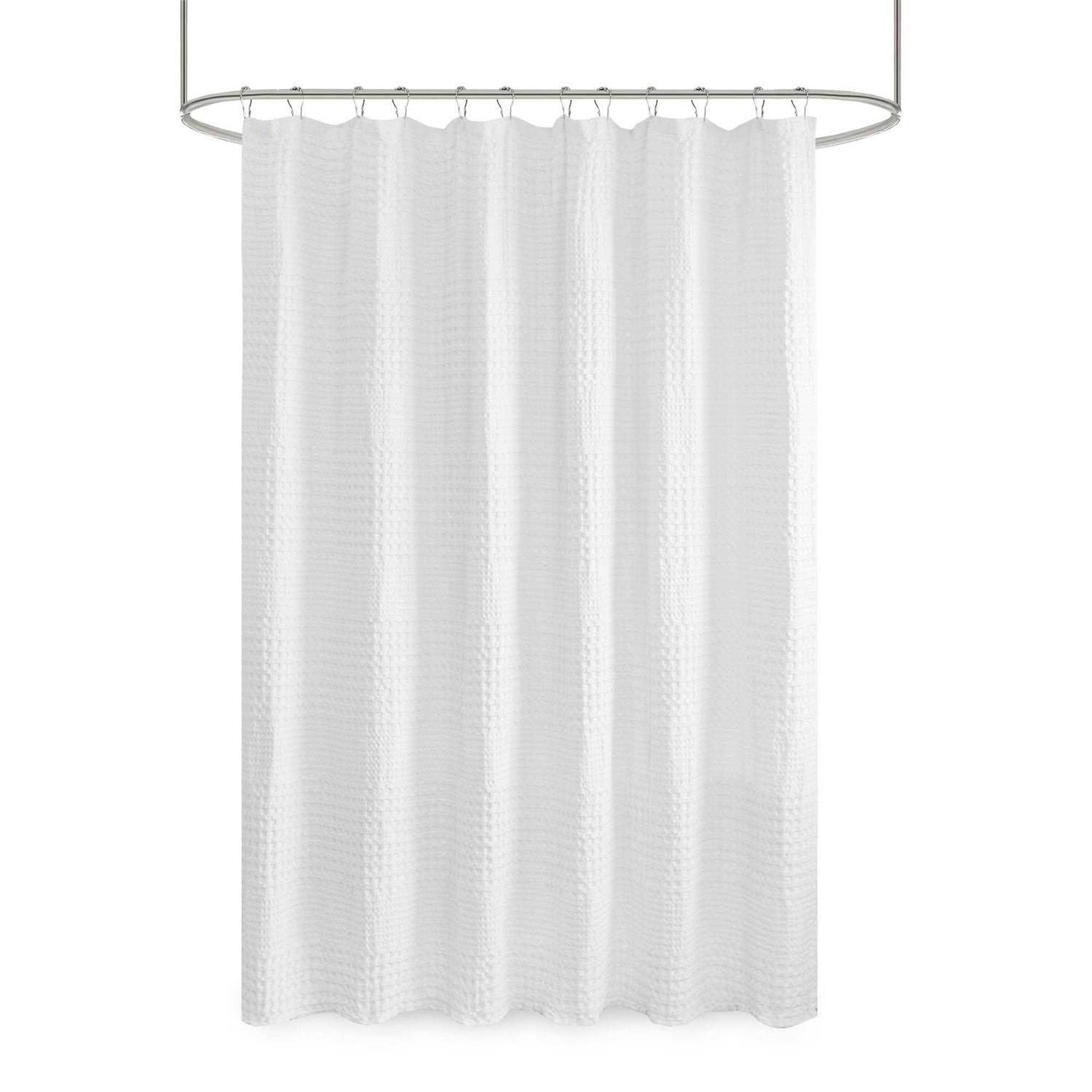 This solid White shower curtain features a heavy waffle weave base fabric that creates a rich texture for a simple and stylish update. The medium weight fabric allows a natural and rich drapability, while the 100% cotton provides the perfect natural touch. Each shower curtain is machine washable for easy care and finished with 12 button holes at the top, making it easy to attach hooks and hang on rod (hooks and rod not included). A water repellant liner is not included, but highly recommended to ensure the best care and handling of this rich medium weight shower curtain. Coordinates perfectly with the Madison Park 800 GSM Bath Towel Collection.