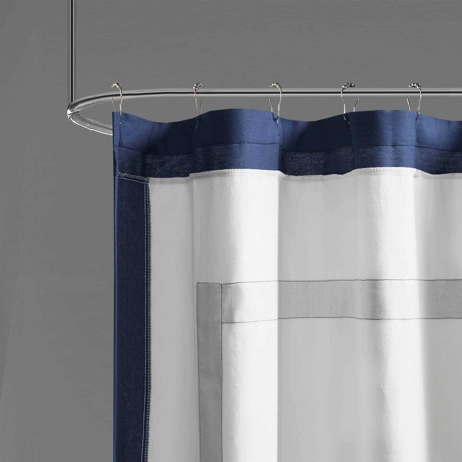 The Madison Park Greyson shower curtain creates a contemporary update to your space. Pieced, cotton duck fabric in solid white is in the center while a navy creates an outer border and inset border for a simple yet colorful new look. Machine Washable for easy care; Each shower curtain measure 72 inchx72 inch and is finished with 12 button holes at the top making it easy to hang; hooks, rod, and a water repellant liner are not included and will need to be purchased separately.