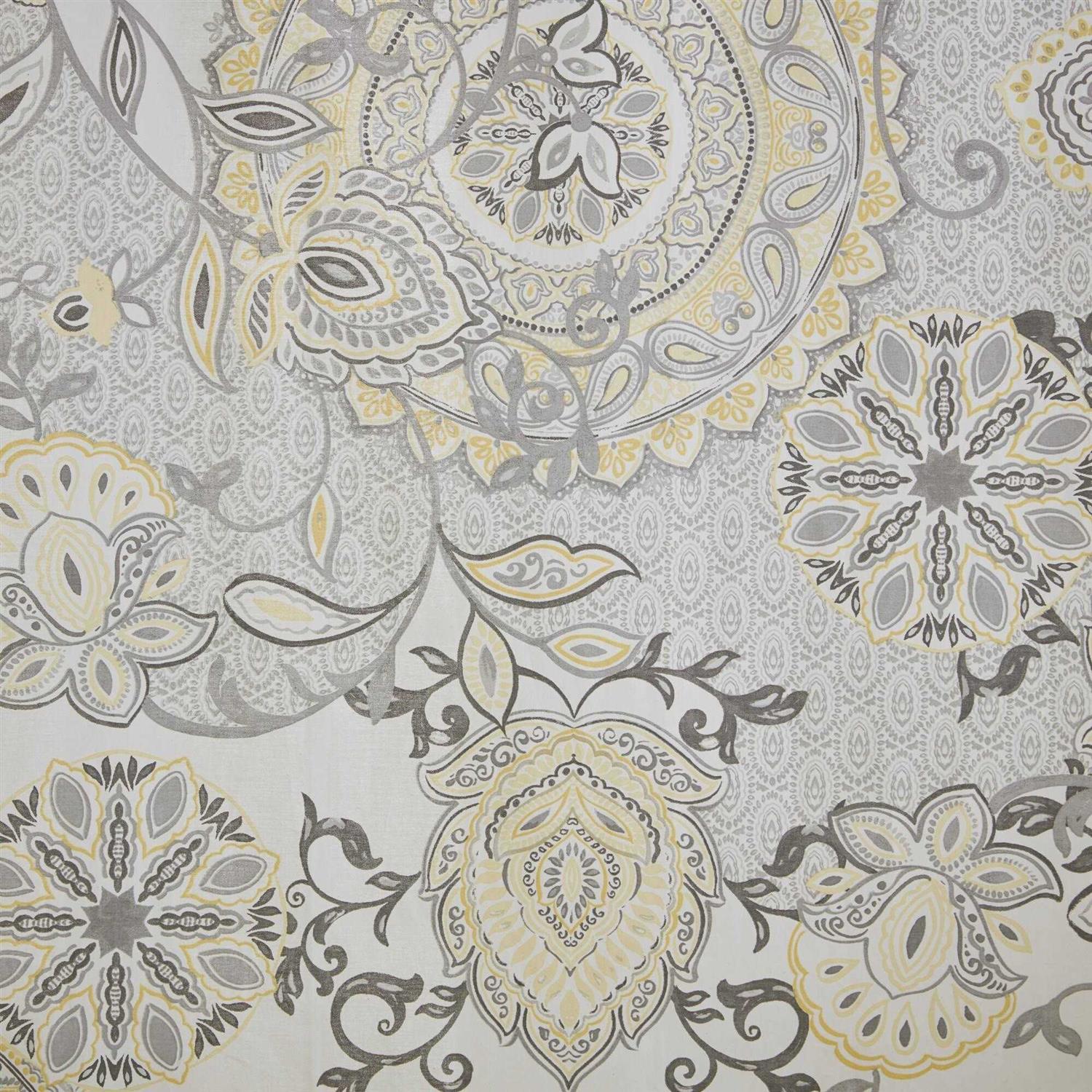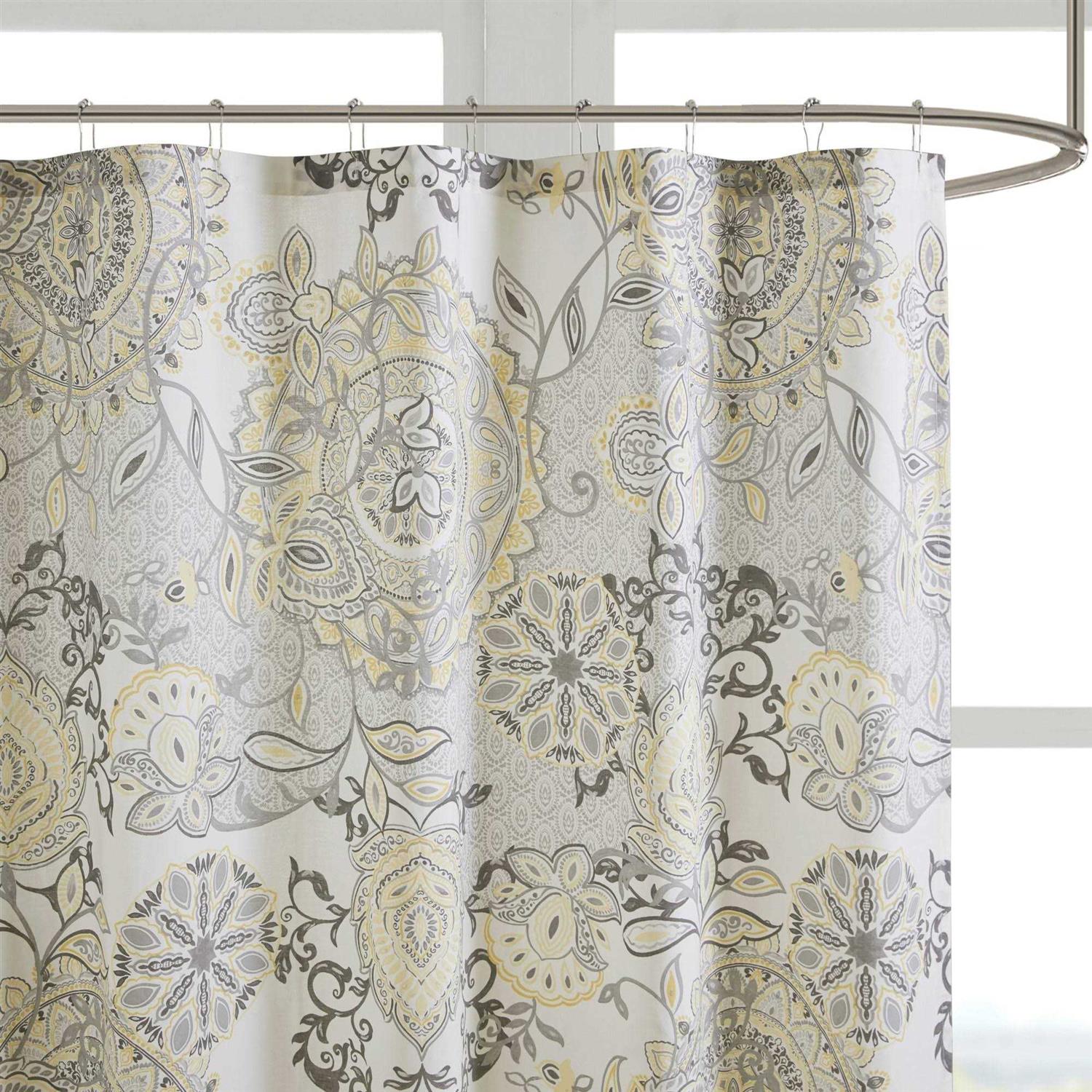 Refresh your bathroom with our Madison Park Isla shower curtain. This printed shower curtain flaunts a beautiful floral and medallion motif in soft yellow and black watercolor hues. While the 100% cotton percale base adds natural appeal for an organic touch to any decor. Machine washable for easy care, this shower curtain is also OEKO-TEX certified meaning it does not contain any harmful substances or chemicals, for the best in quality comfort and wellness. Each shower curtain measure 72″x72″ and is finished with 12 button holes at the top making it easy to hang; hooks, rod, and a water repellant liner are not included and will need to be purchased separately. Complete the look with coordinating bedding, available and sold separately.