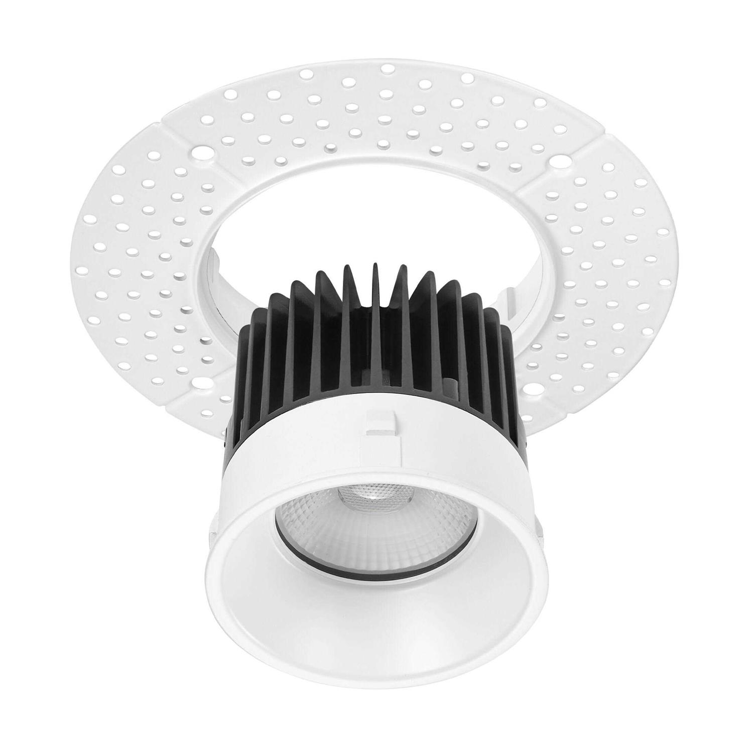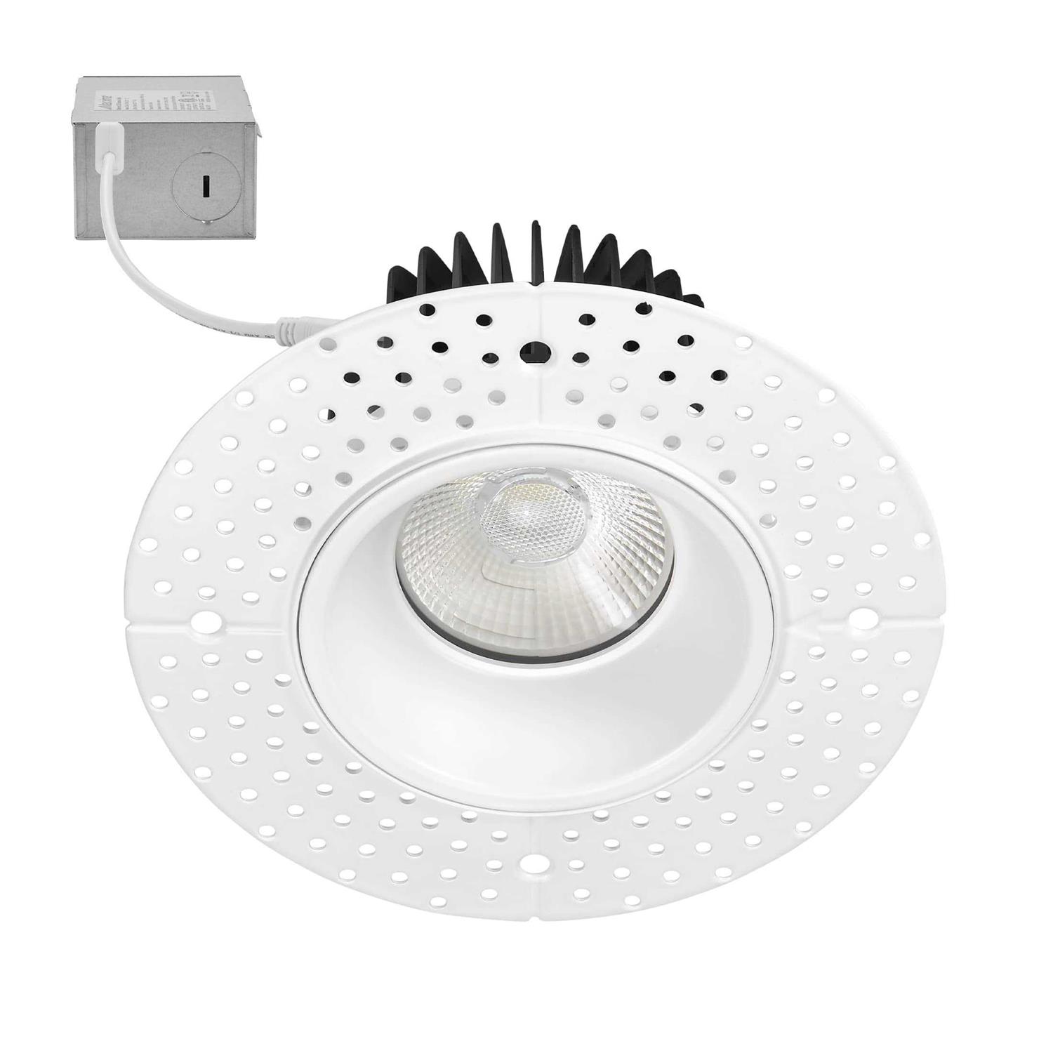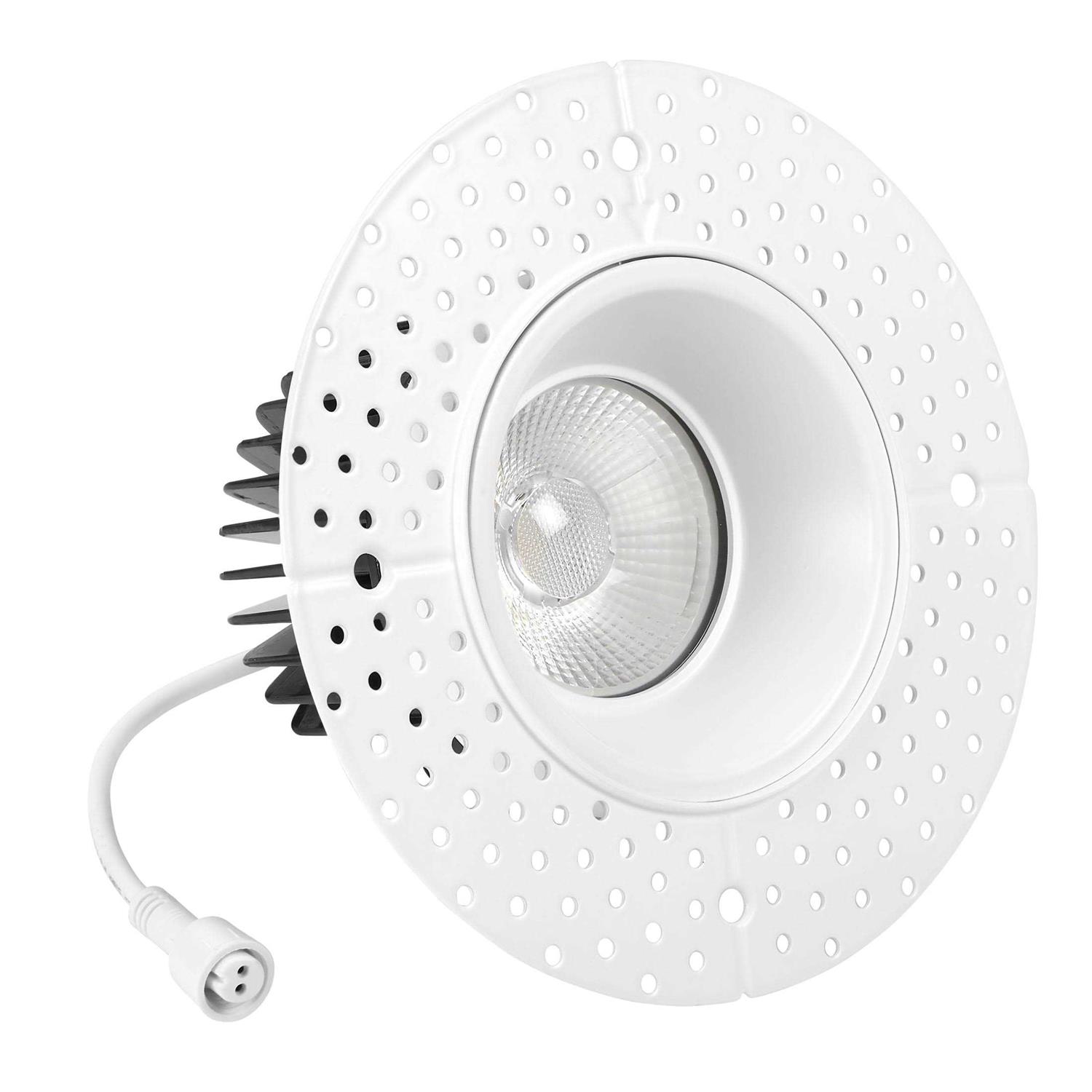 This round trimless anti-glare LED plaster downlight features a deep recess, and a smooth white inner baffle. It is a designer downlight kit that blends into all ceilings, creating a clean sleek look. It is dimmable and color selectable with 2700K, 3000K, 3500K, 4000K, and 5000K options, giving you the ability to easily choose your preferred soft white, warm white, bright white, neutral white and daylight color temperature by utilizing the switch on the back of the fixture. This mud in recessed light provides 1000 lumens of light output and has a high CRI rating of 90, producing the most accurate rendering of colors in your room. It uses just 15 watts of energy, equivalent to a 75W incandescent ceiling light. Easily incorporate your ceiling lights into your ceiling with this frameless recessed design featuring a low-profile that is simply installed and spackled over to give a seamless and beautiful designer look to your space. Each downlight kit comes with a frame that you plaster onto the ceiling and paint over to hide the standard trim that slim downlights typically have. The integrated LED twist locks into place so you can easily remove without damaging your ceiling. It comes with a metal junction box (J-Box), giving you everything you need to install this light. It is rated for wet locations making it ideal for bedrooms, living rooms, bathrooms, showers, kitchens and more.