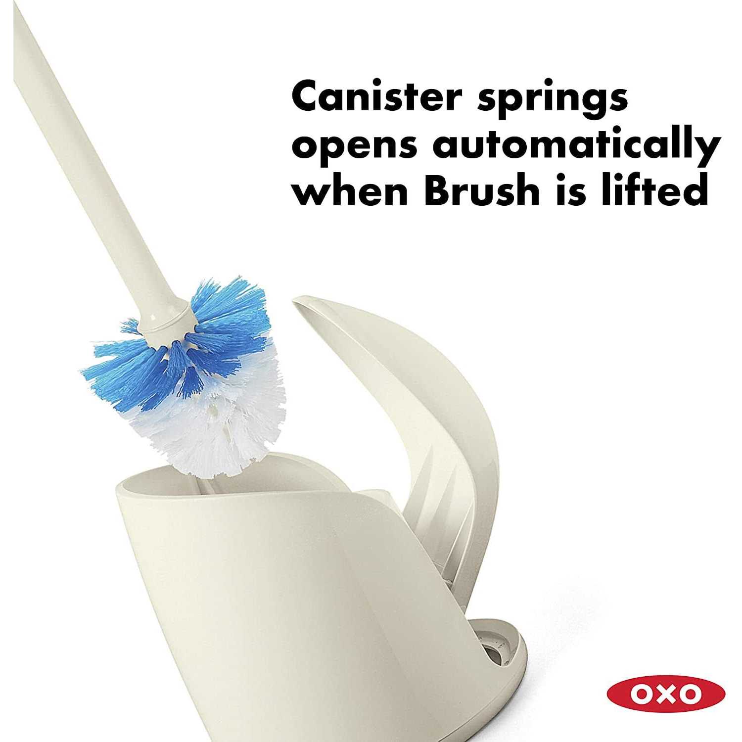 Canister door opens automatically when Toilet Brush is lifted and neatly stores Brush when not in use. Toilet Brush features tapered Brush head and sturdy blue bristles for deep cleaning under the rim and other hard-to-reach places. Shape of handle is designed for a secure, comfortable grip. Canister drip tray features ventilation slots that allow water to quickly evaporate. Compact footprint is ideal for small spaces. OXO’s Compact Toilet Brush and Canister is the perfect addition to any size bathroom. The unique Canister design allows the Toilet Brush to be stored within easy reach. Simply lift the Brush and the Canister door automatically opens. The shape of the handle is comfortable to hold and the Brush head features durable bristles and a tapered shape for deep cleaning. After cleaning, simply replace the Brush in the Canister for neat, compact and sanitary storage. A built-in drip tray in the Canister bottom catches excess water and allows it to quickly evaporate.