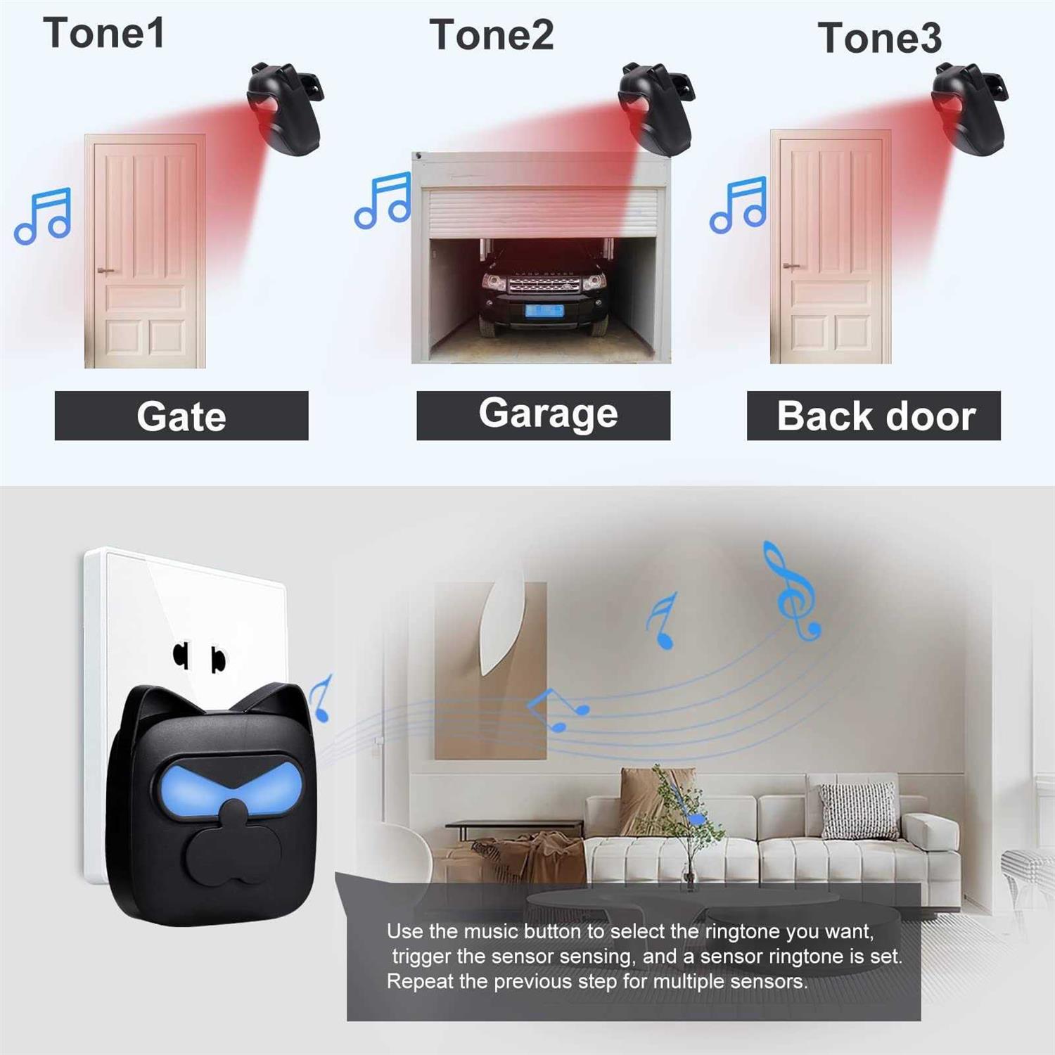 【IP65 Waterproof & Dustproof】Best wireless driveway alarm IP65 dustproof and waterproof; working temperature ranges from -4 °F-140 °F; withstands various harsh weather conditions; wireless driveway alarm for home, apartments, school, villas, offices, warehouses, hotels, factories, hospitals and more. 【Wireless Plug-in Receiver】The portable wireless plug-in receiver plugs into any standard outlet. The sensor uses 3 AAA batteries (Not Included). Infrared sensor detects motion and sends a signal to the receiver. Detection time delay in between motion sensor alerts is configurable from 15 seconds to 30 seconds, just place the sensor at the entrance to your driveway and the receiver inside your home. 【3 Alert Options & 39 Chimes】The wireless outdoors sensor features 3 Alert Options (Audio Chimes/Flashing/Chimes and LED), 39 chimes and 3 volume levels from (0db to 80dB) to suit your needs. Different sensors can be set to a different tone,you can know which sensor triggered the alarm by the different tone. 【328 Feet Long Wireless Transmission Range】Working range up to 328 feet (100 meters) between receiver and transmitter allowing you to place it a good distance. and the sensors’ detection range is up to 23 feet. Improving the design of the infrared detection chip and the detection angle to reduce the false alarms from the sunlight/rain/fog/snow/wind/temperature change and etc. 【Wide area coverage】The wireless weather resistant motion sensor can be used to monitor&protect your outdoor/indoor property. It works through thick walls, trees and metal siding buildings. It will not interfere with other equipment in your home or those of your neighbors, ensures that you will never miss any visitors, even if you are several rooms away. good