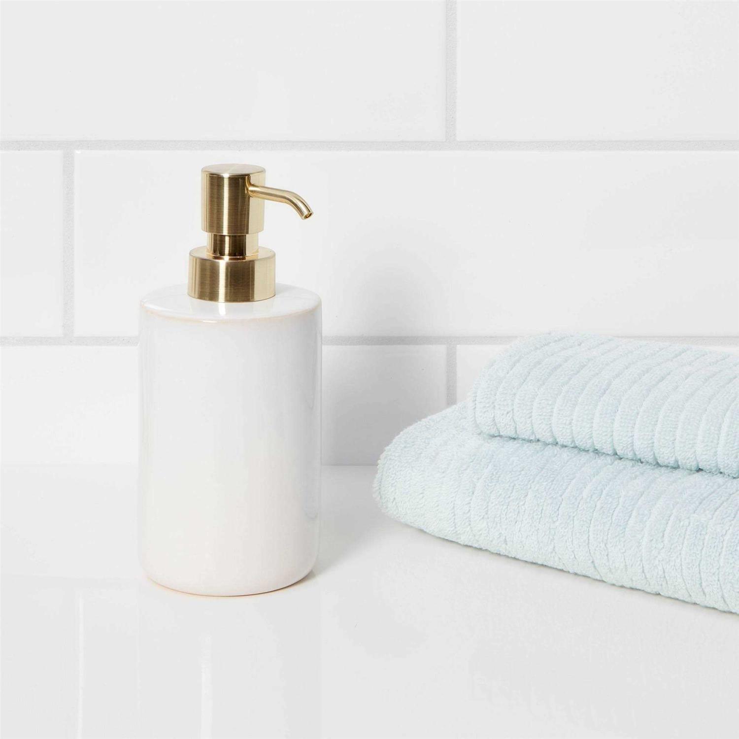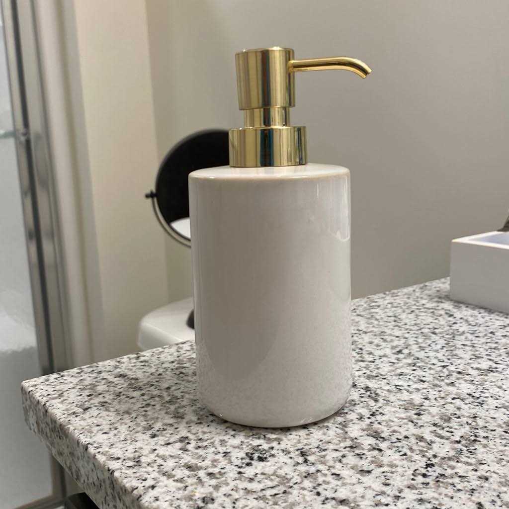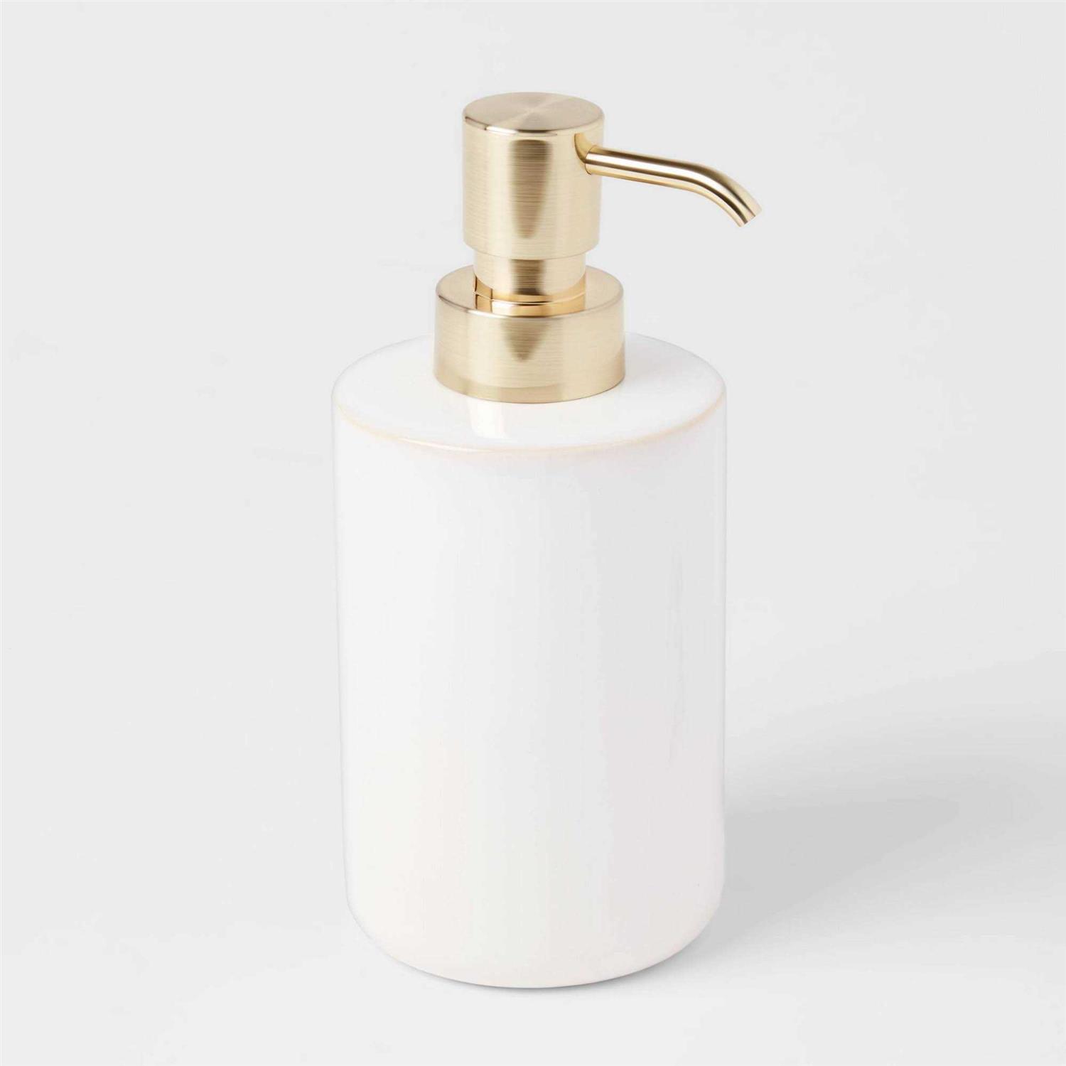 Bring a striking update to your bathroom decor with this Ceramic Foaming Soap Pump from Threshold . This ceramic soap dispenser features an easy-to-use pump for easy dispensing of just the right amount of liquid soap onto your palms. Featuring a glazed ceramic finish in an off-white hue with a golden pump, it instantly brings eye-catching appeal to your bathroom counter. Pair it with a coordinating soap dish, toothbrush dispenser, bathroom canister and other bath accessories to complete the look.