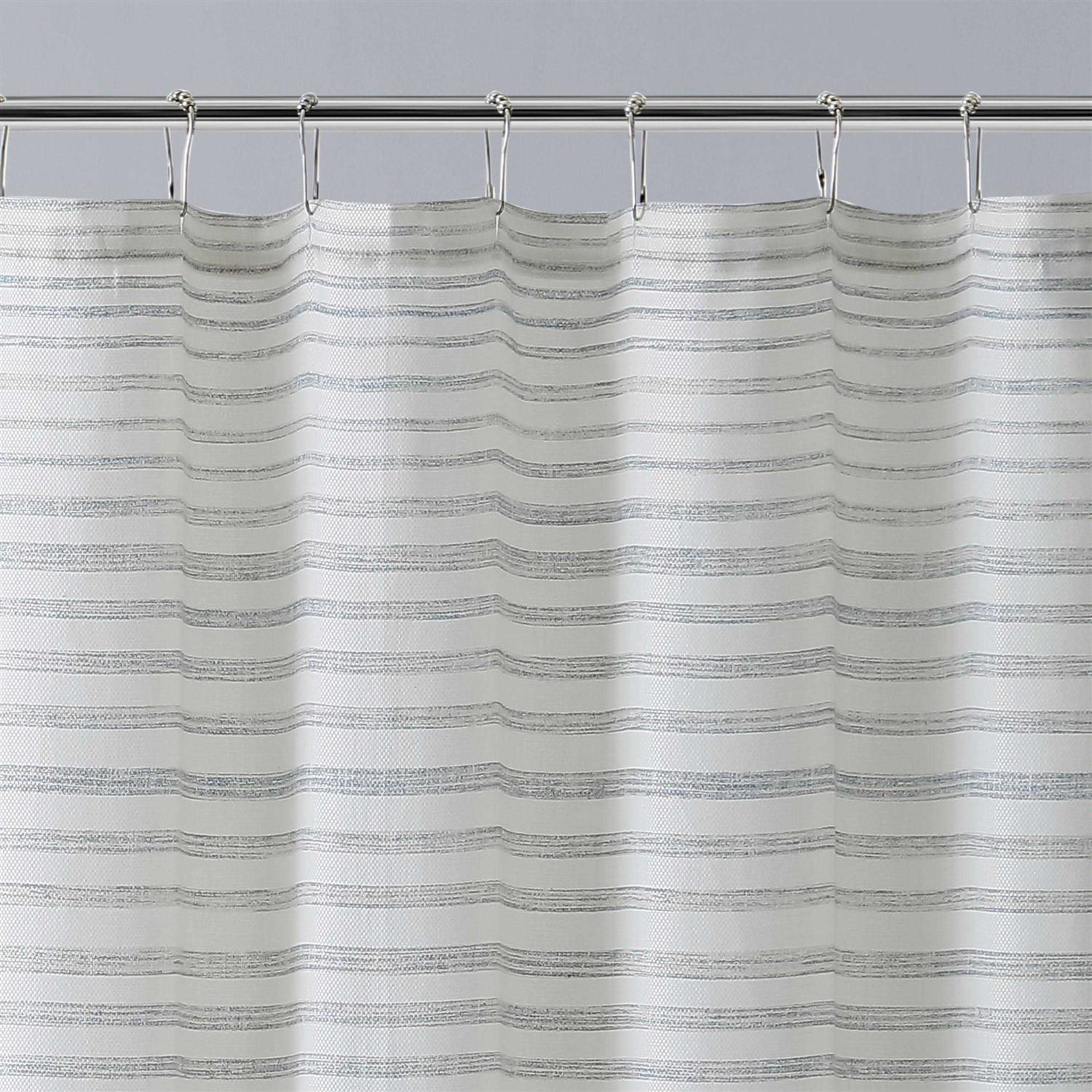 - DESIGN: This shower curtain features irregular stripe horizontal grey stripes on a beige ground.