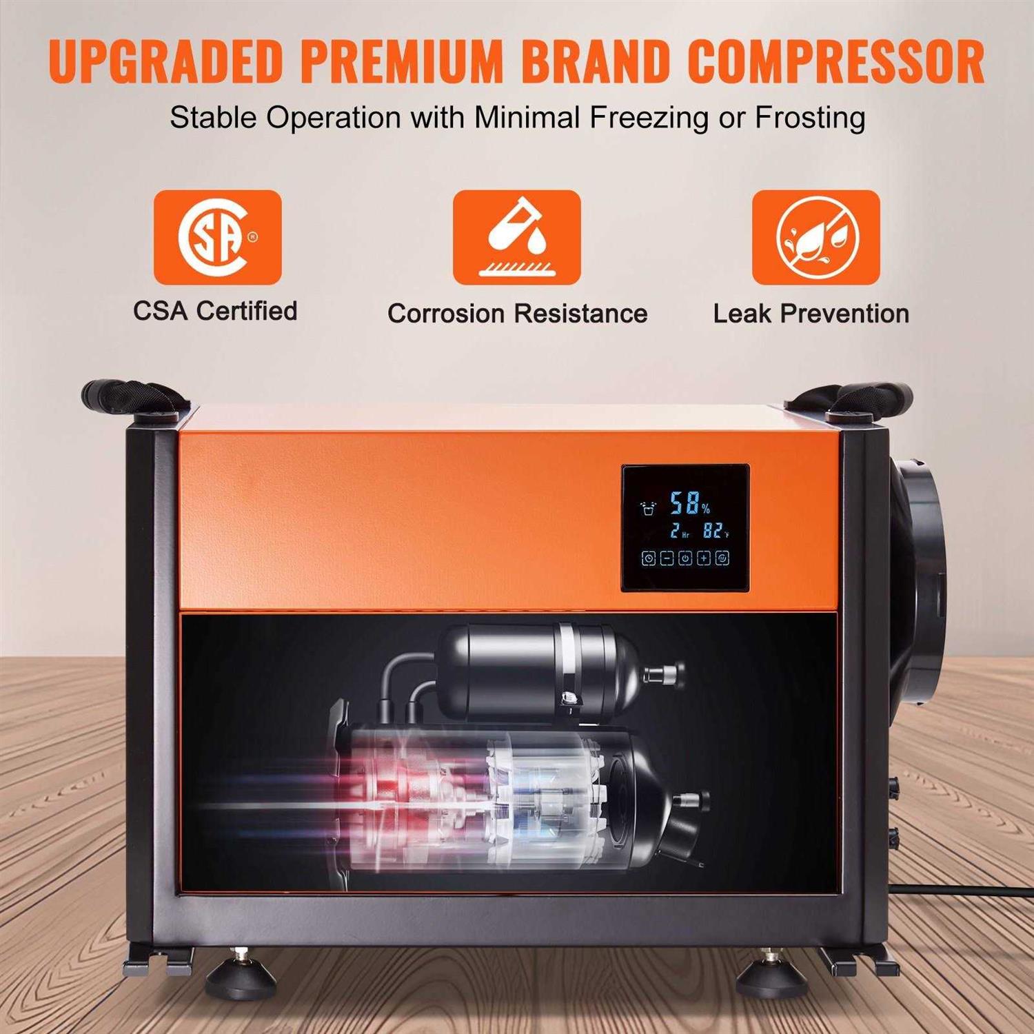Efficient Dehumidification: VEVOR commercial dehumidifier can remove 125 Pints at saturation, 60 pints per day at AHAM, the airflow intensity is 210 CFM, which can efficiently dehumidifies up to 1,300 square feet. Suitable for use in home living rooms, basements, crawl spaces, laundry rooms, garages, storage rooms, and more. Safety and Stability Performance: This high-quality dehumidifier uses leading brand compressors and copper tube condensers, which are corrosion-resistant and leak-proof. When a defrost signal is detected, an automatic defrost cycle is run to avoid frost build-up and related problems. CSA safety certification ensures product performance and safety. Convenient Operation: VEVOR dehumidifier feature LCD display for easy settings adjustment, including a 24-hour timer and memory function. Offers automatic dehumidification, continuous high-power dehumidification, and sleep mode. 3-speed options and customizable humidity settings for user convenience. Easy Installation: Securely install the product using screws for the unit body and the air outlet. Four bottom pads are included for stability. Connect a hose or place the dehumidifier over a floor drain for hassle-free setup. Simple installation that can be done by one person. Designed For The Modern Home: This dehumidifier was designed with the user in mind, with a smaller size, compact design and sturdy handle that can be easily and safely transported from one job site to another, or even from downstairs to upstairs. With it you can easily maintain a healthy 45-55% humidity range!